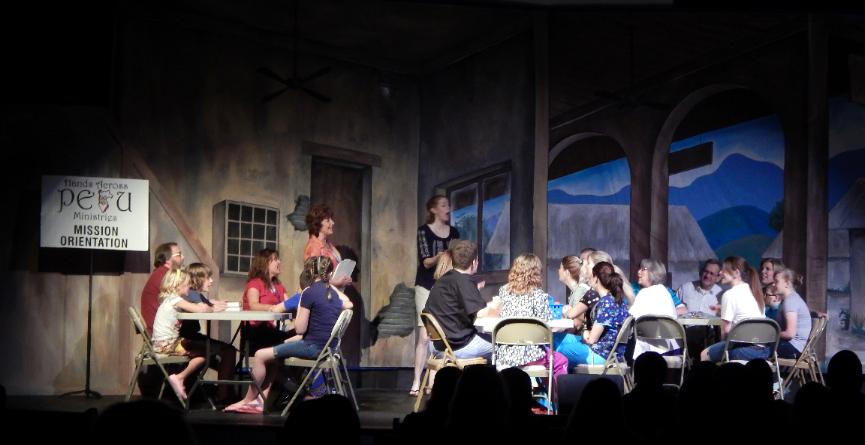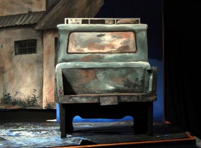 | The folks at Cornerstone asked Seger to come up with three full-stage scenes that would help tell the story of a mission to the country of Peru. To accommodate the variety of scenes, he created an airport drop with three distinct areas, a Peruvian drop with three areas, and an Andes drop at sunrise. To top it off, they asked him to come up with a pickup truck to load on stage. He responded with three 12' x 48' drops that were all stapled to a batten across the back wall, each one being pealed away as it was done being used, thus revealing the next scene. |