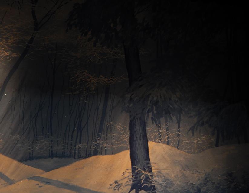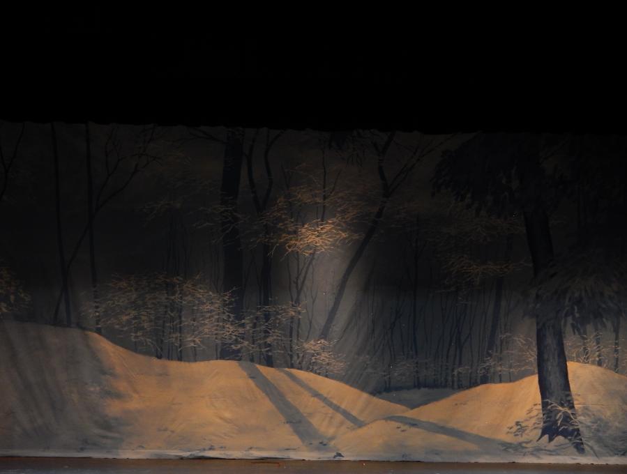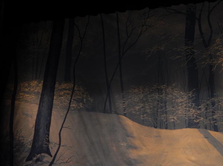 | Michele Xiques, Artistic Director for the Delaware Dance Alliance, asked her former drama teacher Eddy Seger to create a new Snow Scene for her Nutcracker Ballet. He decided to present the scene as a sun-filtering icy deciduous forest with evergreens gently intruding. Through the ingenious engineering of Kevin Reb, an ordinary high school theater was transformed into something magical. |