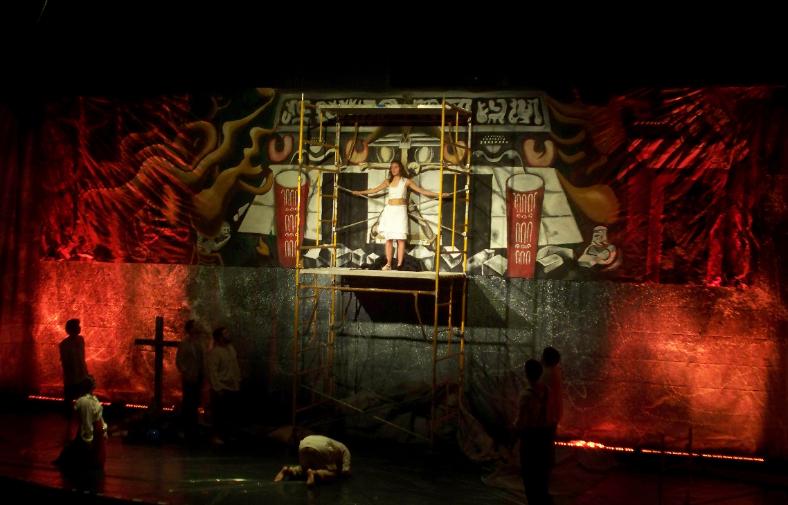 | Midway through the opera, Siqueiros reveals the mural. |