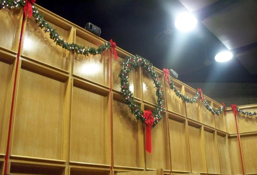 | For the University of Delaware Music Department, Seger decorated Loudis Recital Hall with festoons of lighted garland, a six-foot wreath, and ribbon streamers accenting the oak paneling. |