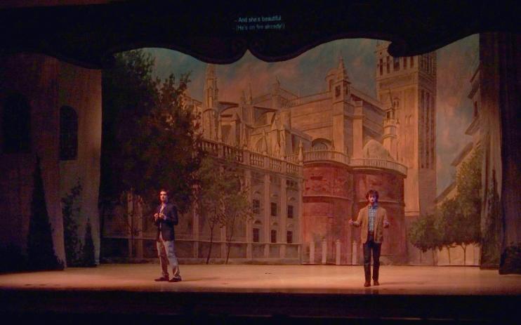 | Don Giovanni and Leporello in the Seville town square. |