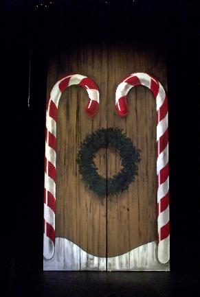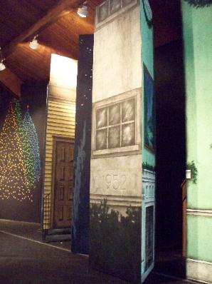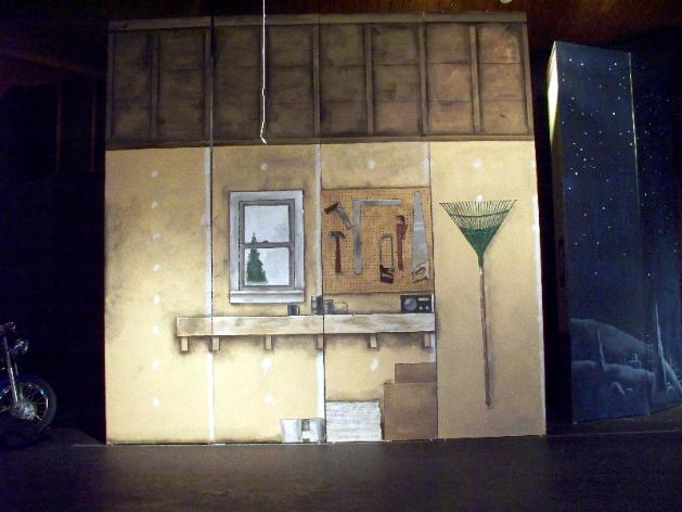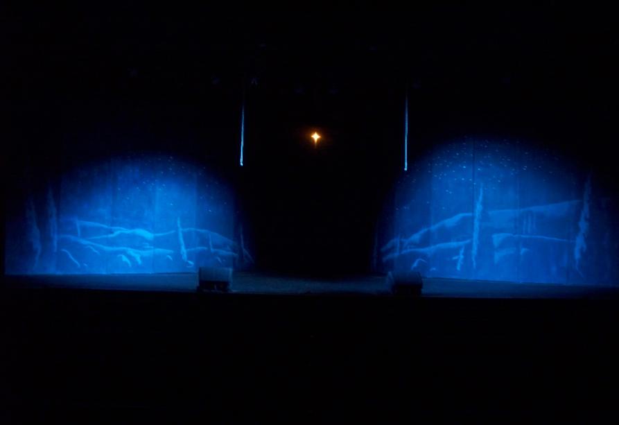| Seger fashioned a star from a velvet-covered board, clear light bulb, dimmer, paper and some scrim - suspending it behind a scrim painted to look like the tree lights of Loockerman. The Baby Jesus (previous page) was fashioned from two milk cartons filled with Christmas lights and wrapped in muslin. The dimmer-controlled lights provided the only illumination on the faces of Mary and Joseph. |