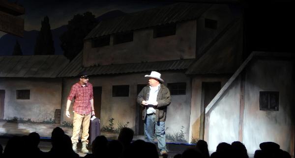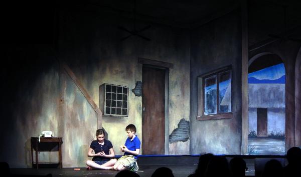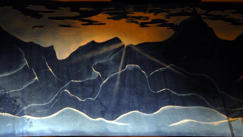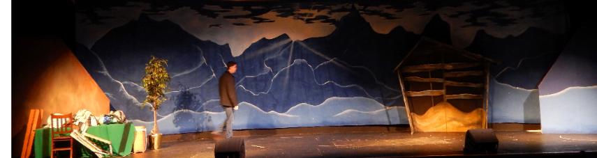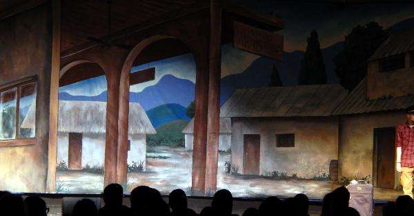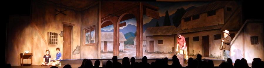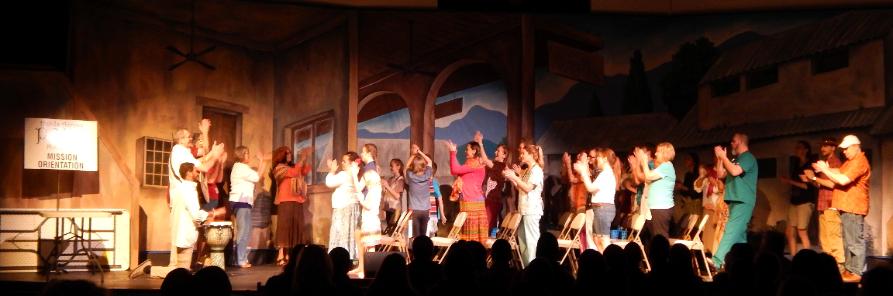 | The folks at Cornerstone asked Seger to come up with three full-stage scenes that would help tell the story of a mission to the country of Peru. To accommodate the variety of scenes, he created an airport drop with three distinct areas, a Peruvian drop with three areas, and an Andes drop at sunrise. To top it off, they asked him to come up with a pickup truck to load on stage. He responded with three 12' x 48' drops that were all stapled to a batten across the back wall, each one being pealed away as it was done being used, thus revealing the next scene. |