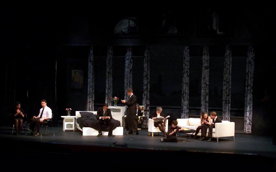 | Originally set in 1299 Florence, Dr. Smith updated the scene to a contemporary high-end New York apartment, asking for a portrait of the mule (spoken of in the libretto) to be placed over the bed of the deceased. Seger responded with an edgy look, including gray walls and woodwork, twelve-foot Jackson Pollack drapery, a balcony with a view of Central Park and the New York skyline in the distance, and artwork on the walls, highlighted by the three large (five by five) panels above the windows. |