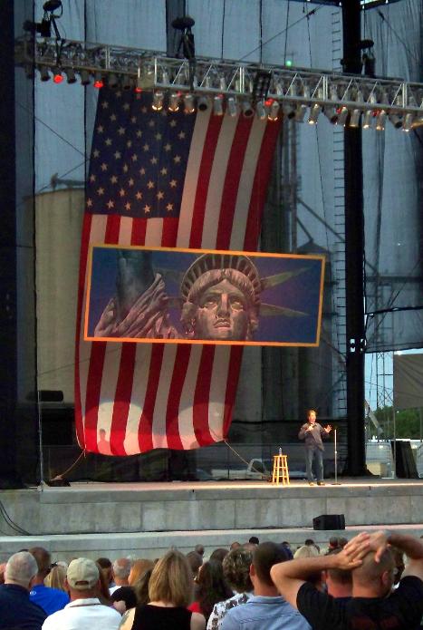 | The folks at the Delaware State Fair asked Seger to create a setting for Jeff Foxworthy's Comedy Show that also included a tribute to the USO for Memorial Day. C.F. Schwartz of Dover generously donated a thirty-three-foot flag to complement his twenty-four-foot Lady Liberty. |