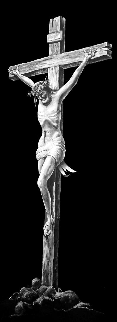 | After an on-stage crucifixion, Seger's six-foot painted cutout emerges from the darkness, first silhouetted against a stormy sky, then revealed as the crucified Jesus. |