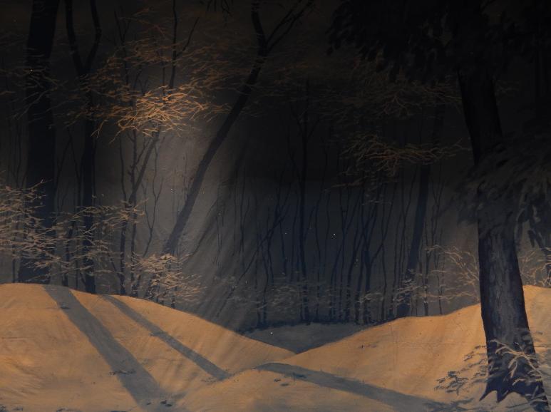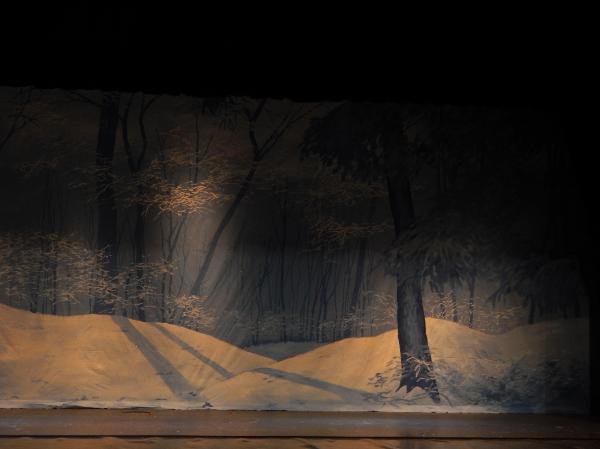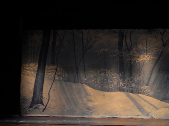 | Michele Xiques, Artistic Director for the Delaware Dance Alliance, asked her former drama teacher Eddy Seger to create a new Snow Scene for her Nutcracker Ballet. He decided to present the scene as a sun-filtering icy deciduous forest with evergreens gently intruding. Through the ingenious engineering of Kevin Reb, an ordinary high school theater was transformed into something magical. |