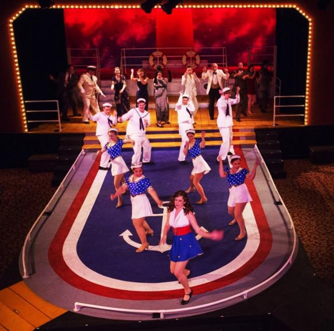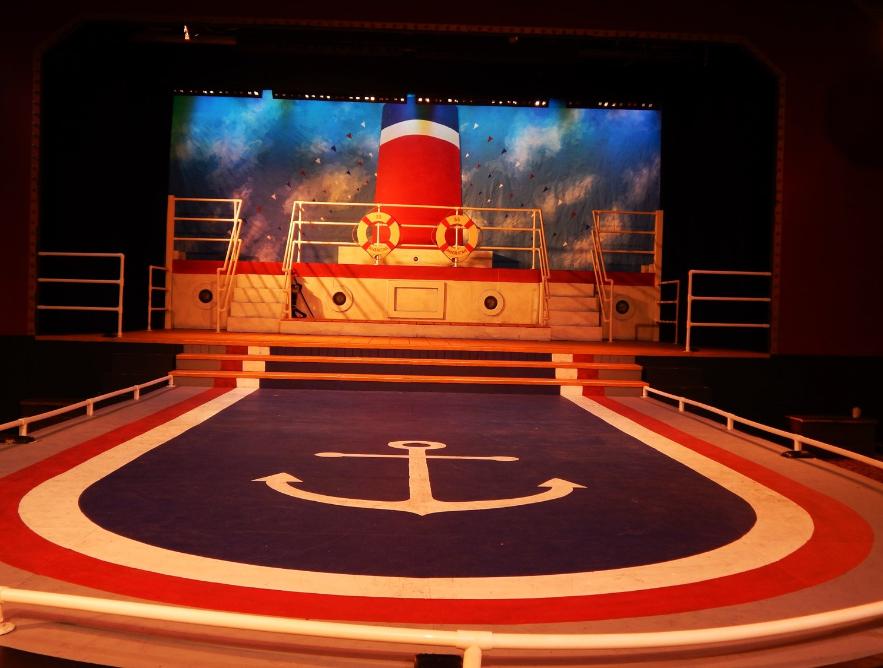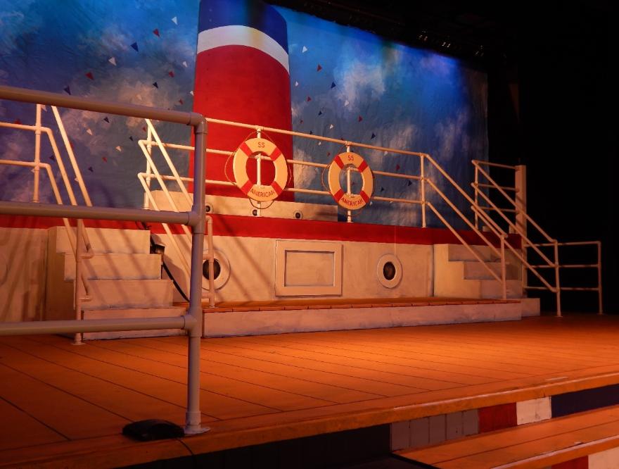 | Director David Button asked Seger to come up with a ship deck that would allow extensive dancing and utilize a 40"x 4'x 24' platform and steps that Seger had built for the summer shows. He answered with PVC piping and a design that leaves little doubt that we are on board a ship (listing to port in this photo). |