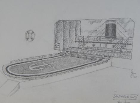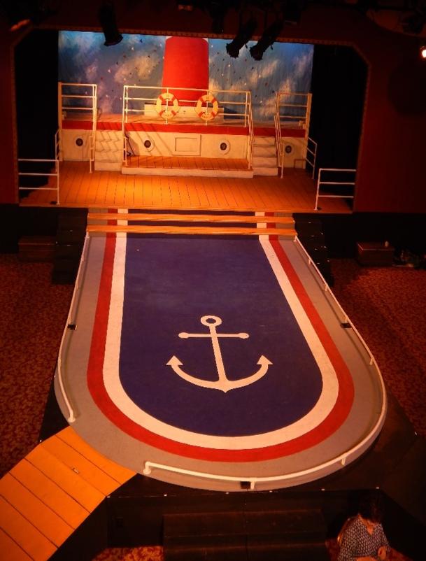 | With a twenty-five-foot thrust, the stage at Clear Space lends itself to the creation of a ship. This view is from the "Orchestra Pit" balcony. Seger says he paints the floor for the show's musical director and accompanist, Melanie Latzko Bradley. |