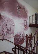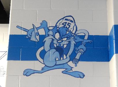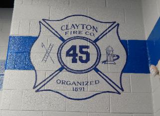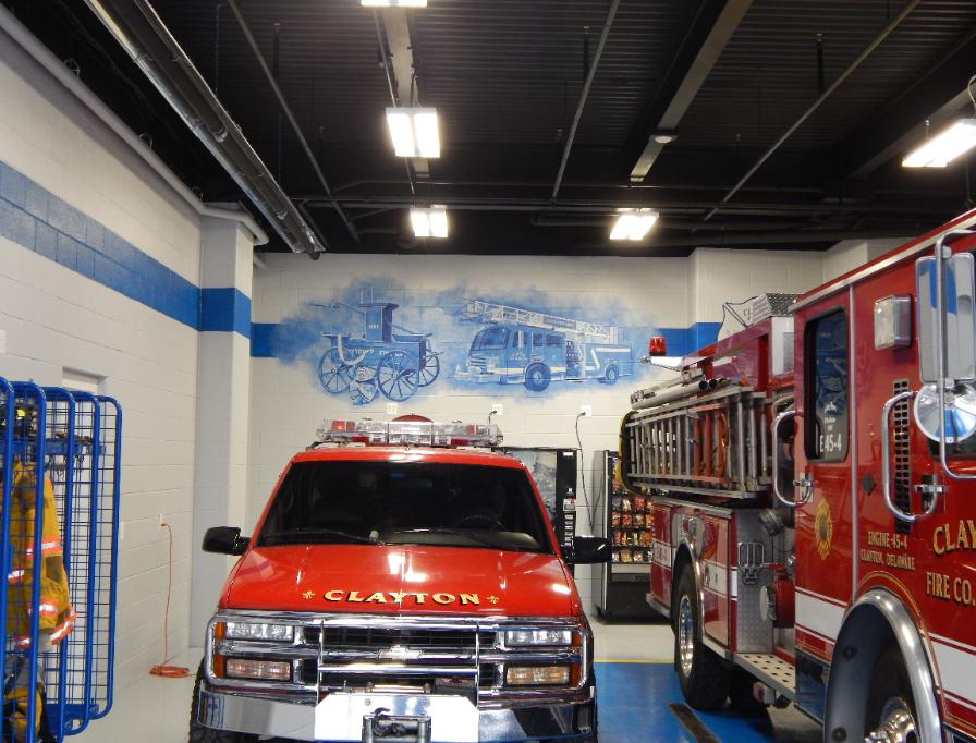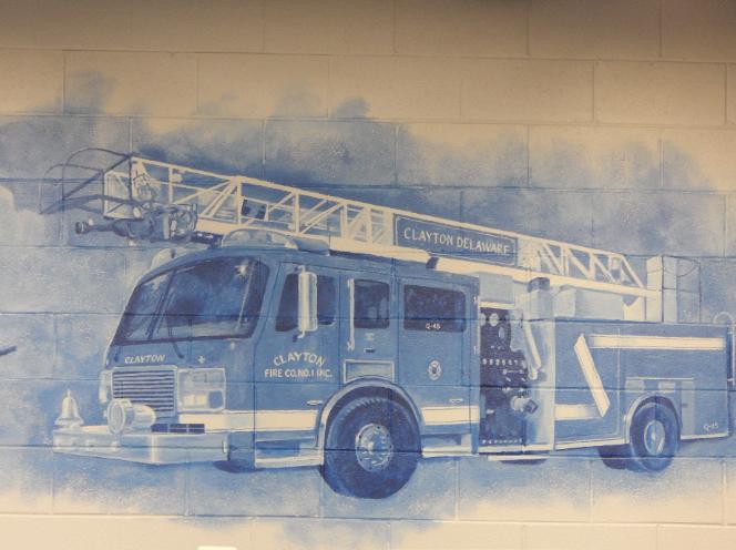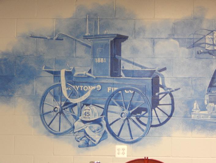 When Seger offered to paint a mural for the Clayton Fire Company's new building, he had a single picture in mind. After they showed him the walls available, he took them all. In the apparatus bay, he decided to paint their old pumper and the modern Quint, as well as their Maltese Cross and their mascot, the Tazmanian Devil. |