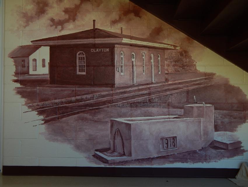 | Under the stairway, Seger painted the Clayton train station and ninety-seven-year-old watering trough. |