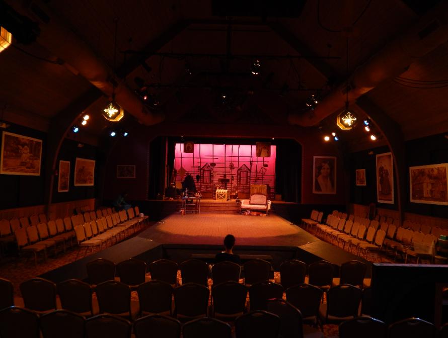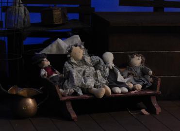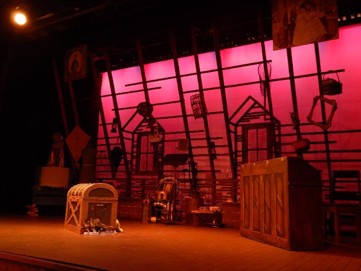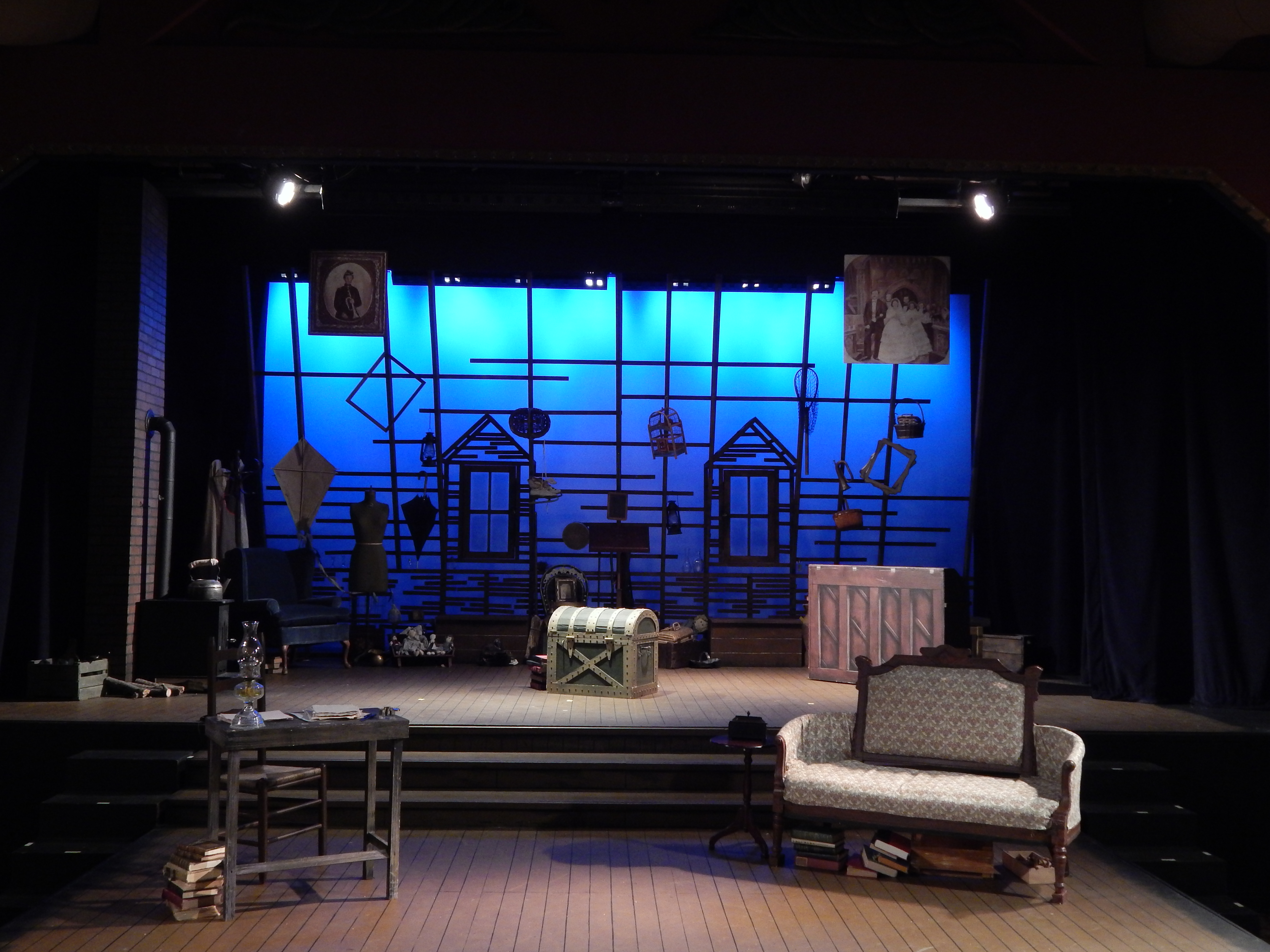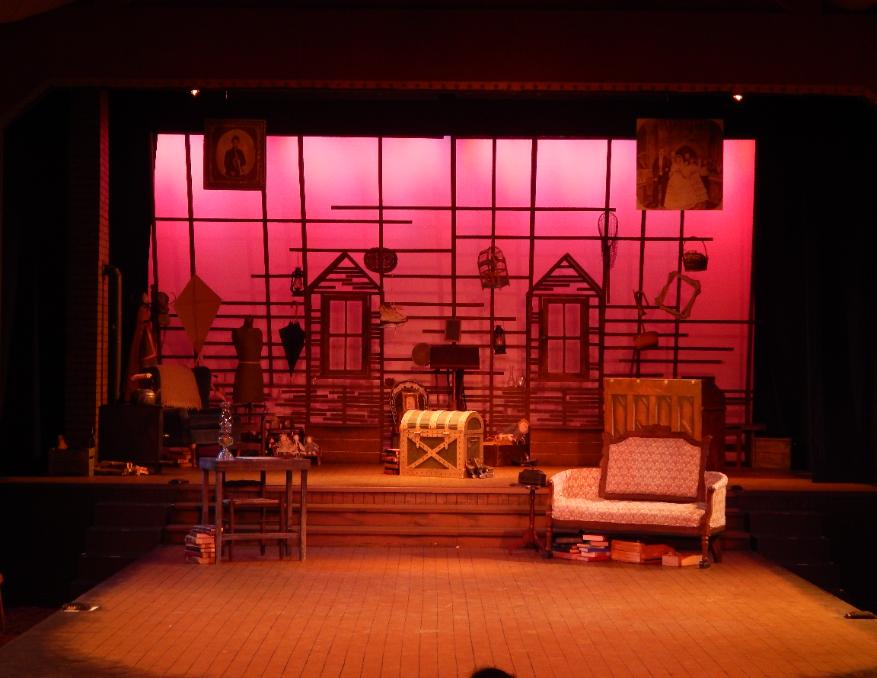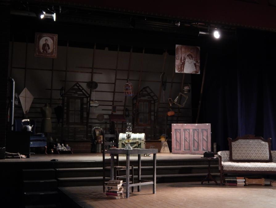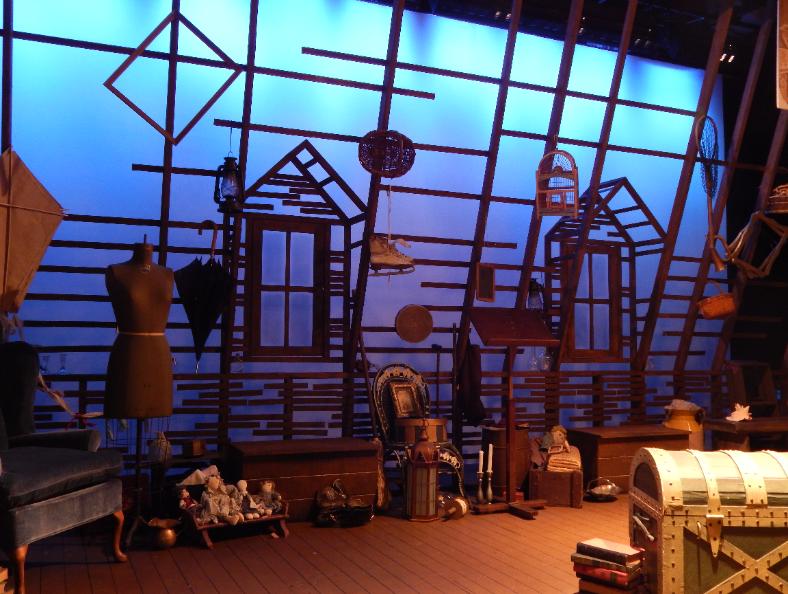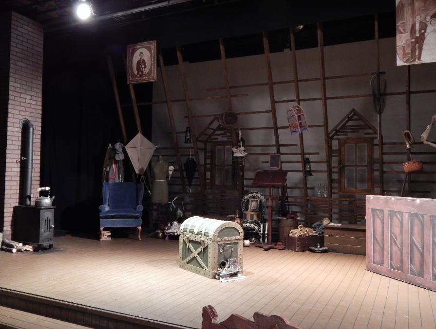 | David Button asked Seger to come up with a versatile attic to serve as the memory space for Jo March, the Little Women sister and author (Louisa May Alcott). He devised an open structure with outlines of a wall, roof and dormer windows to allow the lighting to work its magic. Civil War era sepia photographs complete the scene. Button and Seger combined on the decor. |