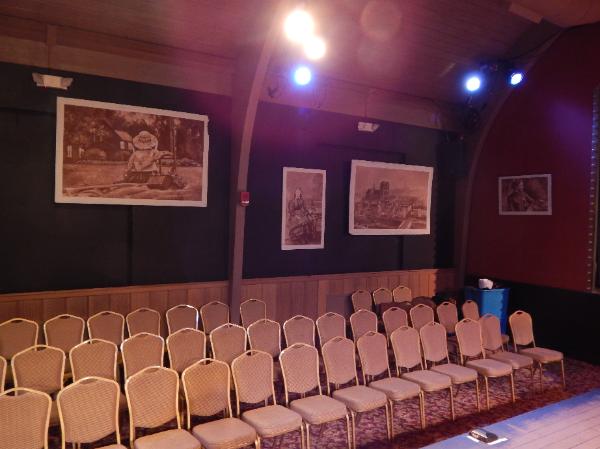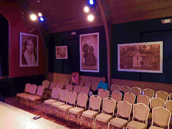 | The audience-right view, including a young Louisa May, gargoyles from Paris, a married couple and the Alcott home. |